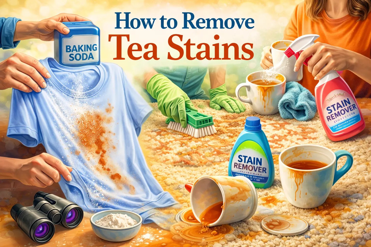 • ভেজা দাগের ওপর সরাসরি বেকিং সোডা ছিটিয়ে দিন; এটি চা শুষে নিয়ে রঙ ফিরিয়ে আনবে।