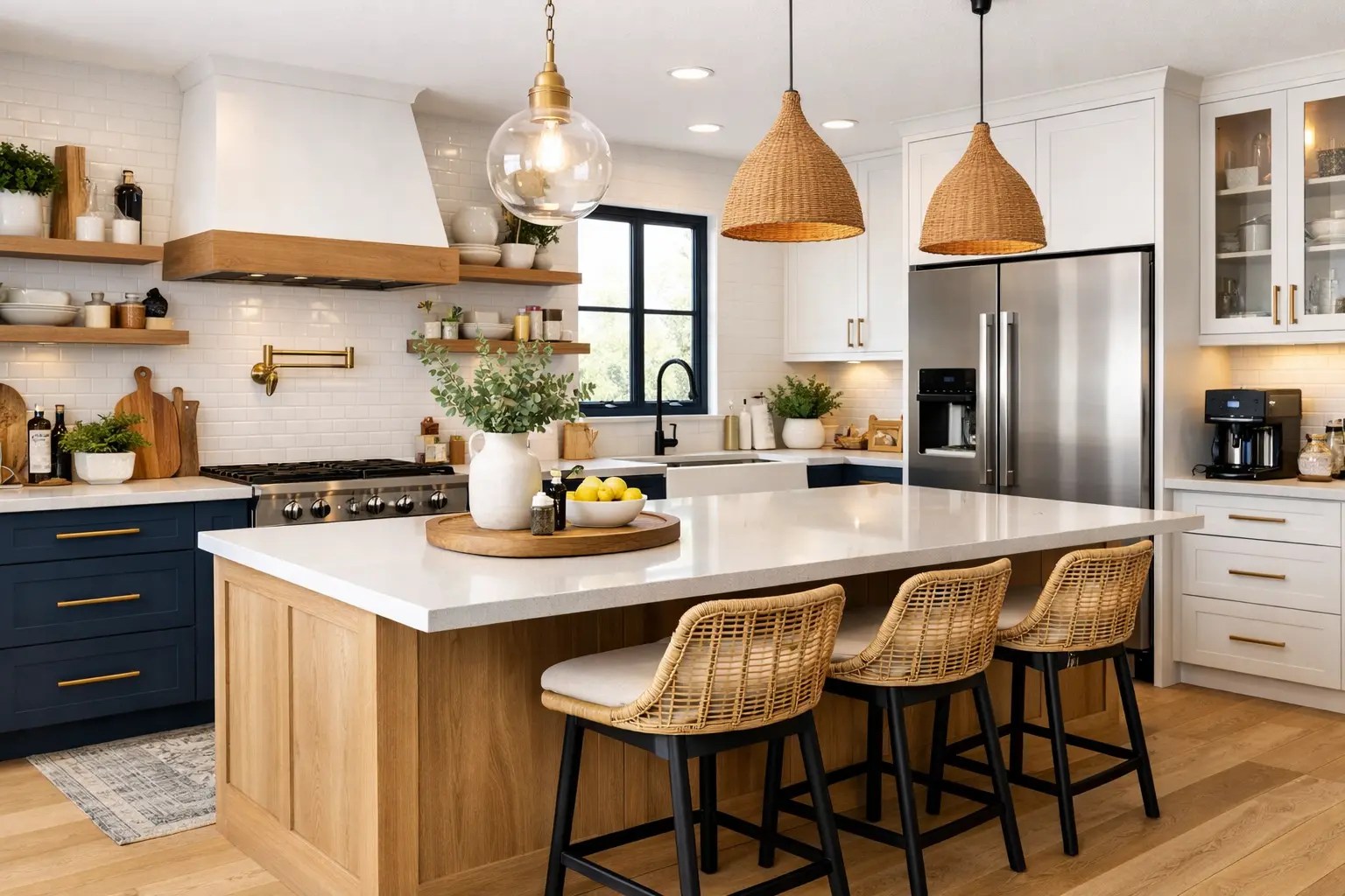 Ciptakan tampilan kohesif dan menarik secara visual dengan memperluas lantai kayu keras ke bagian depan pulau dapur. Elemen desain ini menambahkan kedalaman dan minat, mengaburkan garis antara lantai dan kabinet.